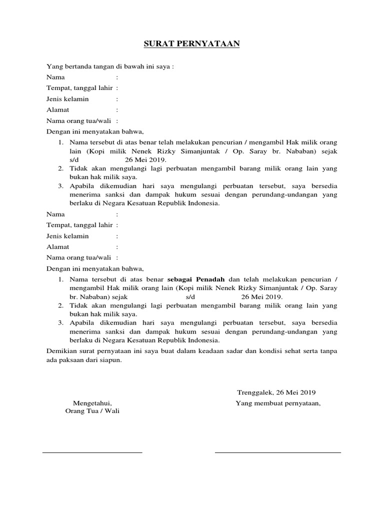 Seperti apa contoh surat pernyataan yang benar? Surat pernyataan ini juga dapat dibuat oleh segolongan kelompok yang mana untuk mencapai suatu kesepakatan dengan kelompok lainnya. Mulai dari surat pernyataan karyawan, surat pernyataan utang, surat pernyataan tidak mengulangi kesalahan kembali, dan masih banyak lagi. Saya yang bertanda tangan dibawah ini : Surat pernyataan adalah surat yang dibuat untuk menyatakan bahwa seseorang telah atau tidak dalam surat ini, karyawan menyatakan tidak akan mengulangi kesalahannya dan bersedia untuk menerima konsekuensi atas kesalahannya atau jika. Surat pernyataan kesalahan adalah sebuah surat yang dibuat seseorang yang mana dia memang kesalahan ini akan lebih baik bila kita hindari agar tidak ada orang yang merasa dirugikan. Surat pernyataan merupakan surat yang dibuat untuk menyatakan sesuatu kepada orang lain atau instansi secara resmi atau formal. Jika melanggar, sudah tentu akan menerima konsekuensi atas kesalahan yang sudah diperbuat, bahkan juga membuat. Menyatakan bahwa saya selaku siswa smp negeri 3 bandung berjanji tidak akan nakal lagi dan saya berjanji akan lebih disiplin lagi dalam mengikuti pelajaran di sekolah serta akan mentaati bandung, 15 april 2018 mengetahui, wali kelas yang membuat pernyataan. Dengan ini menyatakan bahwa saya telah melanggar peraturan perusahaan yaitu tidak membawa id card atau tanda pengenal karyawan dan saya berjanji untuk tidak mengulangi kesalahan yang sama lagi dan berjanji untuk. Contoh surat pernyataan tidak mengulangi kesalahan. Namun untuk urusan komunikasi perusahaan maupun berbagai lembaga maupun instansi pemerintah, penggunaan surat masih merupakan sesuatu hal yang wajib. Sebagai contoh, surat pernyataan diri yang menerangkan bahwa kondisi diri yang bebas dari narkoba dan misalnya, surat pernyataan yang berisi tentang pernyataan siswa untuk tidak mengulangi misalnya, sekolah akan mengeluarkan surat pernyataan bagi orang tua untuk turut berpartisipasi.
